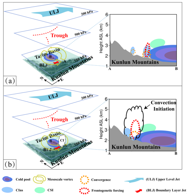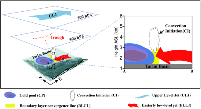 图8. 昆仑山北坡的暴雨天气过程中与中尺度气旋、边界层急流(Boundary Layer Jet,BLJ)和冷池(Cold Pool,CP)等多个系统共同作用的对流触发(CI)机理概念模型(Sun & Abulikemu et al., 2023)。